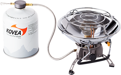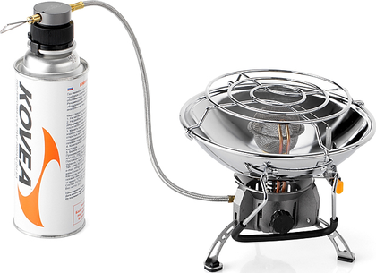 Туристический газовый обогреватель Kovea Fire Ball работает от резьбовых газовых баллонов KGF-0230 и KGF-0450. Также возможно использование цангового баллона KGF-0220 при помощи переходника KA-9504, который поставляется в комплекте.