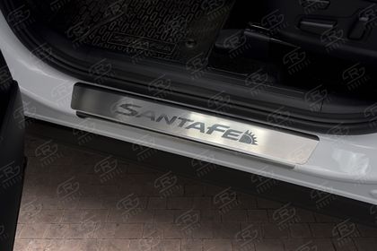 Накладки RusStal на пороги (лист нерж. шлифованный с надписью) для Hyundai Santa Fe IV рестайлинг 2021-2026. Артикул HYSFE21-03
