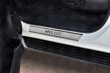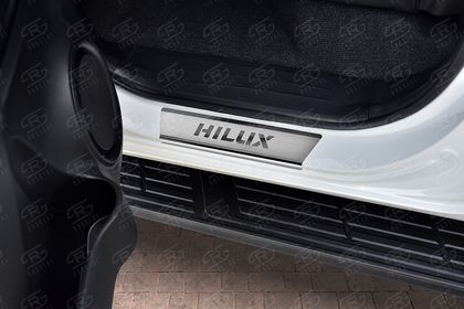 Накладка RusStal на пороги (лист нерж. шлифованный с надписью) для Toyota Hilux VIII 2015-2026. Артикул TOHIL15-03