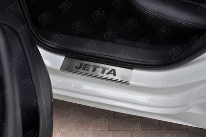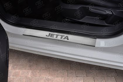 Накладки RusStal на пороги (лист нерж. шлифованный с надписью) для Volkswagen Jetta VI 2014-2018. Артикул VWJET14-03