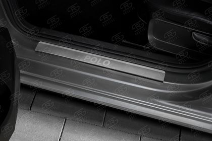 Накладка RusStal на пороги (лист нерж. шлифованный с надписью) для Volkswagen Polo V рестайлинг 2015-2020 седан. Артикул VWPOL15-03