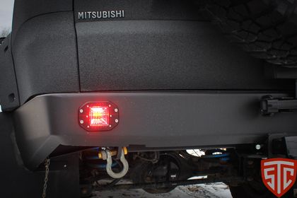 Бампер силовой STC задний для Mitsubishi Pajero Sport II 2008-2015 c квадратом под фаркоп, кронштейном крепления запасного колеса по центру, кронштейном крепления гос номера и фарами заднего хода/ ПТФ. Артикул STC-MPS2-BR-C1-L2