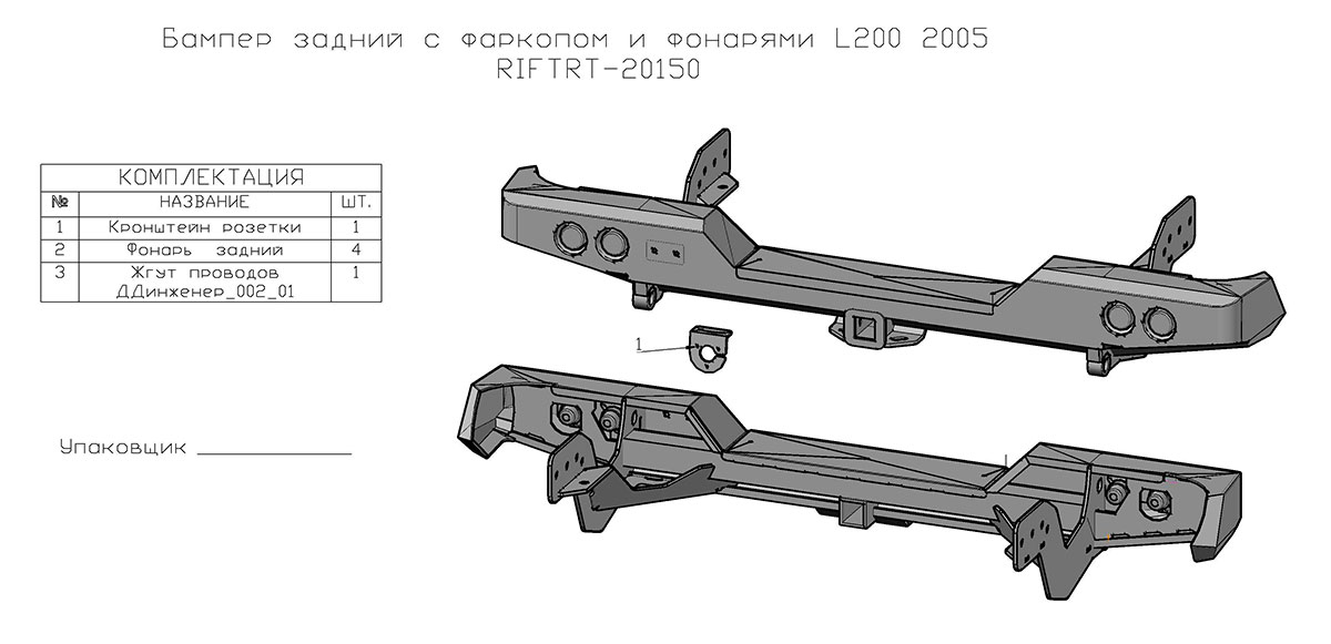 Бампер силовой РИФ задний с квадратом под фаркоп и фонарями для Mitsubishi L200 2005-2015 (кузов 1350 мм). Артикул RIFTRT-20150