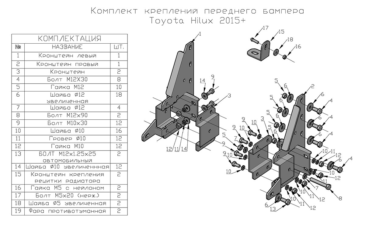 Бампер силовой РИФ передний без доп. фар и защитной дуги для Toyota Hilux VIII 2015-2026. Артикул RIFREV-10306