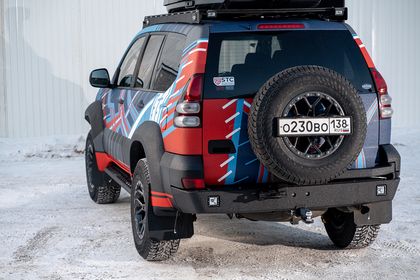 Бампер силовой STC задний для Toyota Land Cruiser Prado 120 2002-2009 с квадратом под фаркоп, кронштейном крепления запасного колеса по центру, кронштейном крепления гос номера и фарами заднего хода/ ПТФ. Артикул STC-TLCP120-BR-C1-L2
