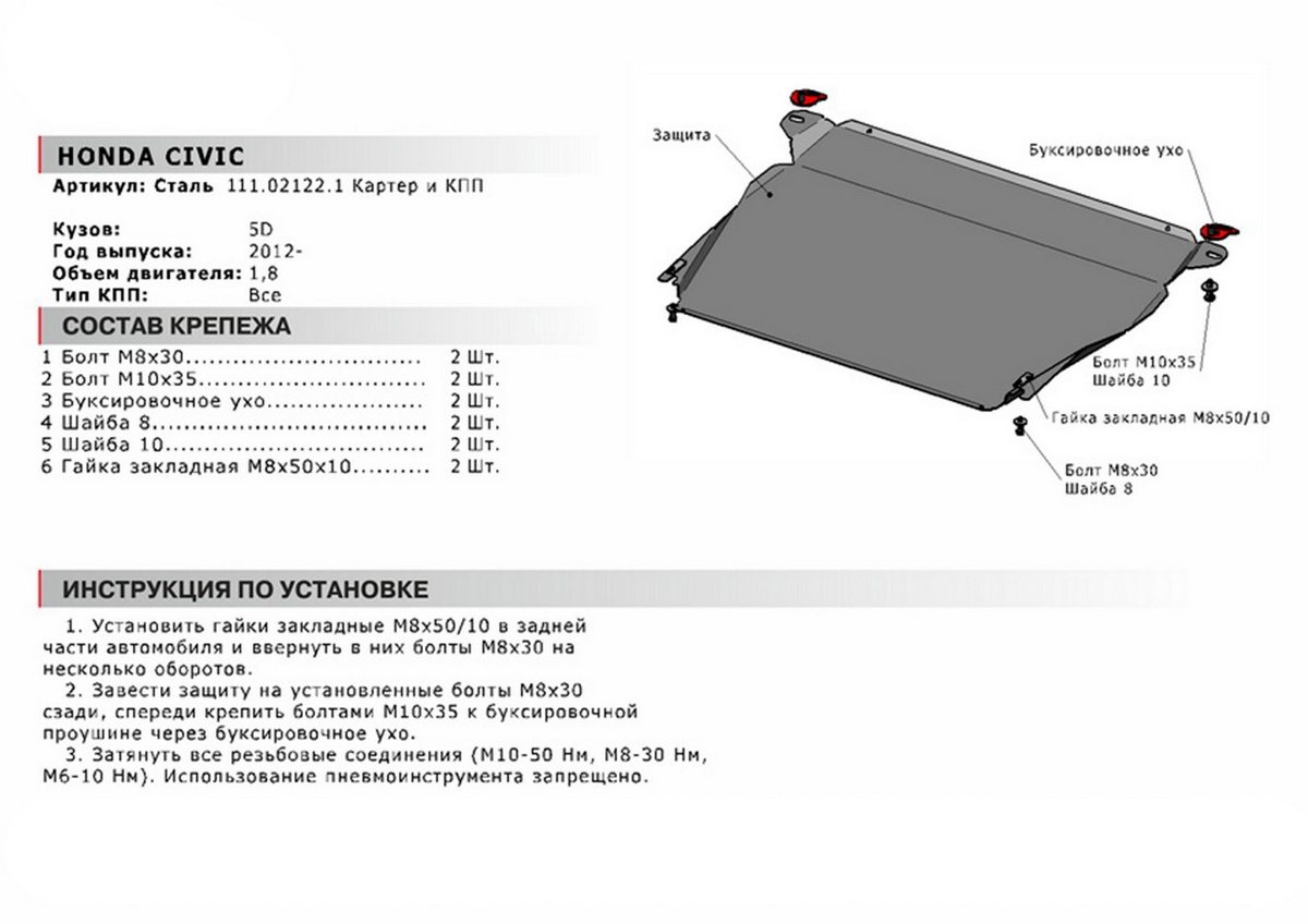| Комплектация | защита - 1 шт., комплект крепежа, инструкция по установке, упаковка |