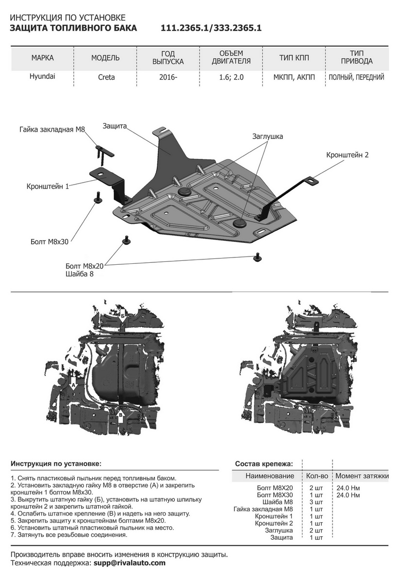 Защита Rival для топливного бака Hyundai Creta II 2021-2026. Артикул 111.2365.1
