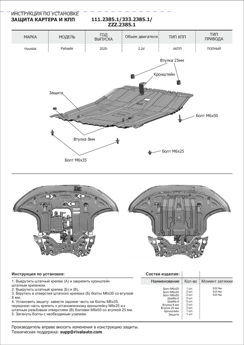 | Комплектация | защита - 1 шт., комплект крепежа, инструкция по установке, упаковка |