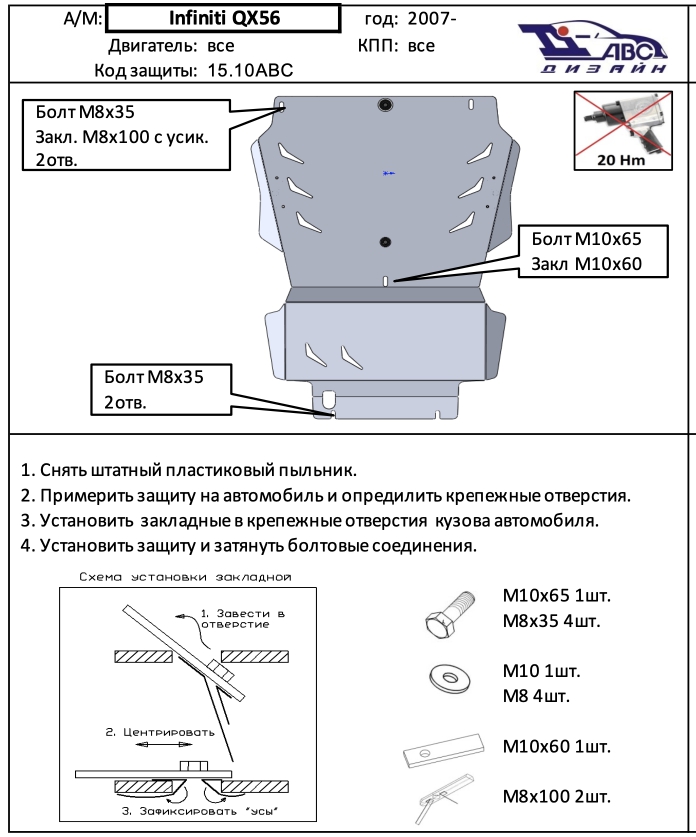 Защита алюминиевая АВС-Дизайн для картера и КПП Infiniti QX56 III 2010-2026. Артикул 15.10ABC