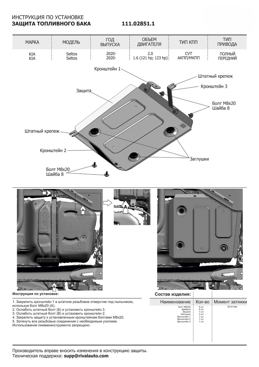 Защита АвтоБРОНЯ для топливного бака Kia Seltos 2020-2026. Артикул 111.02851.1