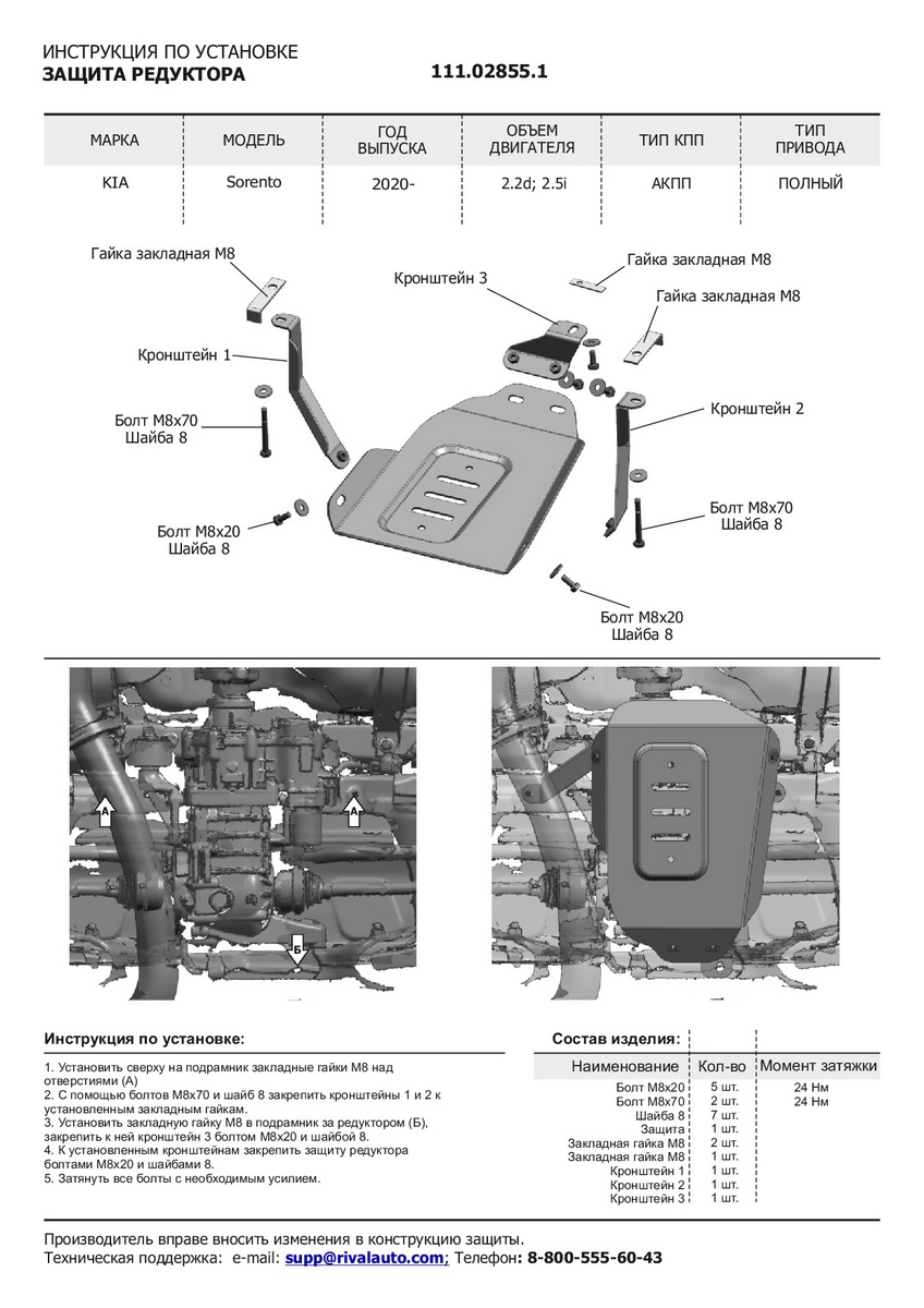 Защита Rival для редуктора Kia Sorento IV 4WD 2020-2026. Артикул 111.2855.1