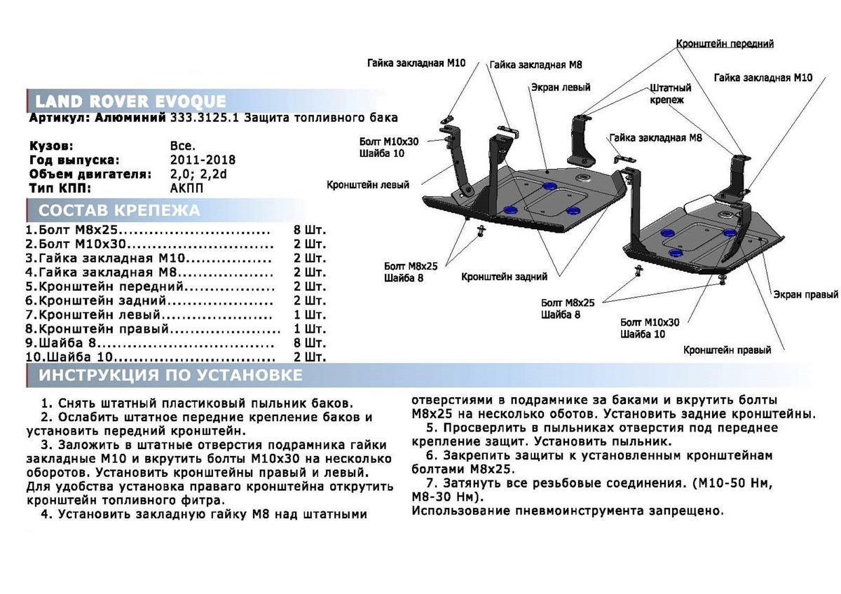 Защита алюминиевая Rival для топливного бака Land Rover Range Rover Evoque I 2011-2018. Артикул 333.3125.1