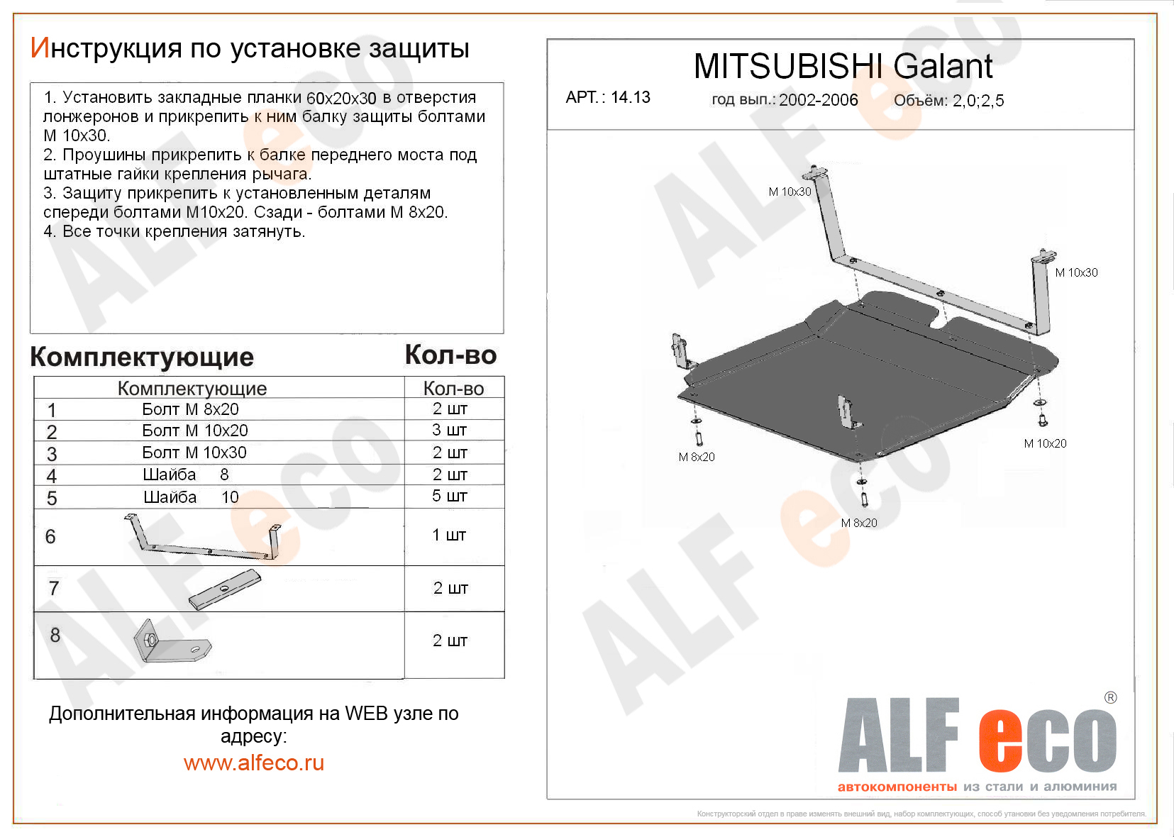 Защита Alfeco для картера и КПП Mitsubishi Galant VIII 2002-2006. Артикул ALF.14.13