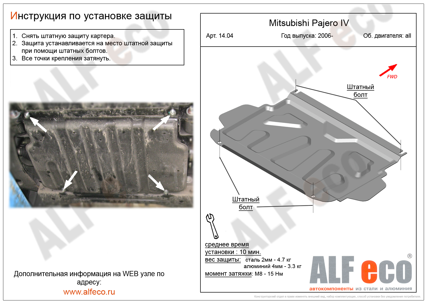 Защита алюминиевая Alfeco для картера Mitsubishi Pajero IV 2006-2026. Артикул ALF.14.04 AL4
