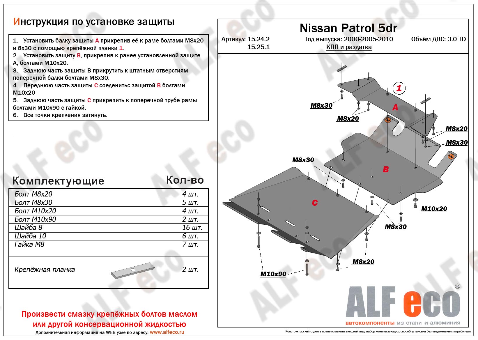 Защита Alfeco для КПП и РК Nissan Patrol Y61 (5-дв. 3,0 TD) 2000-2010. Артикул ALF.15.25.1,ALF.15.24.2
