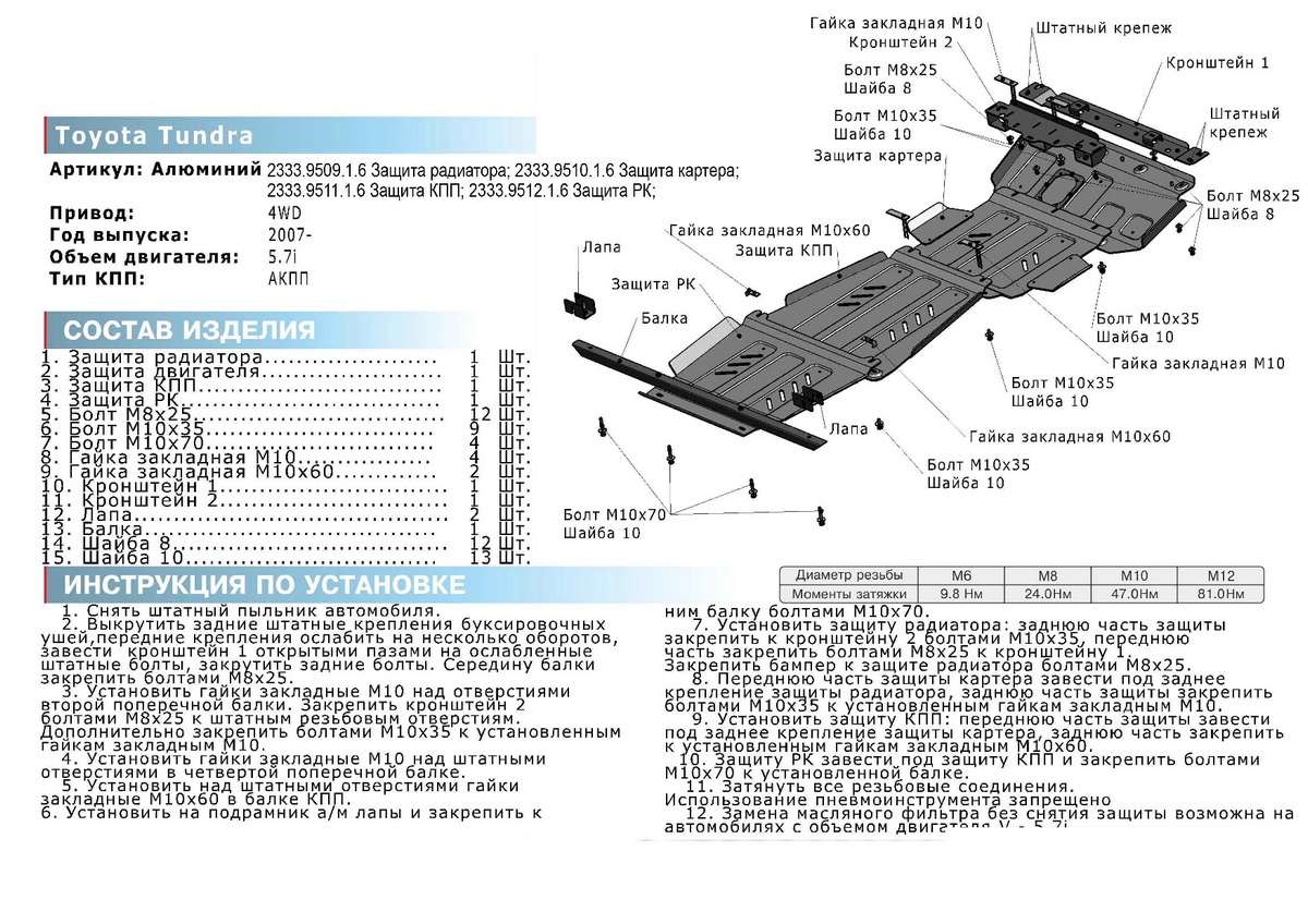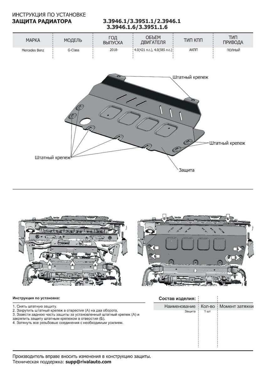 | Комплектация | защита - 1 шт., комплект крепежа, инструкция по установке, упаковка |