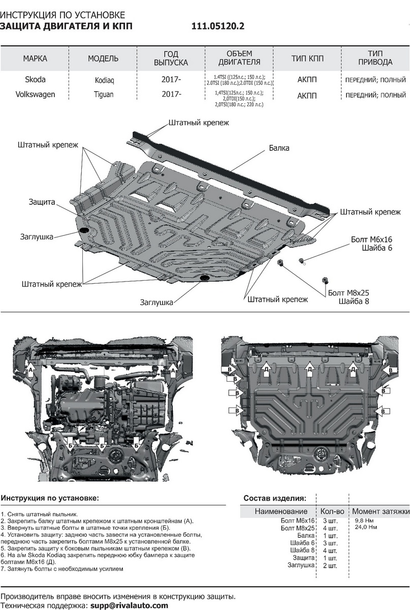 | Комплектация | защита - 1 шт., комплект крепежа, инструкция по установке, упаковка |