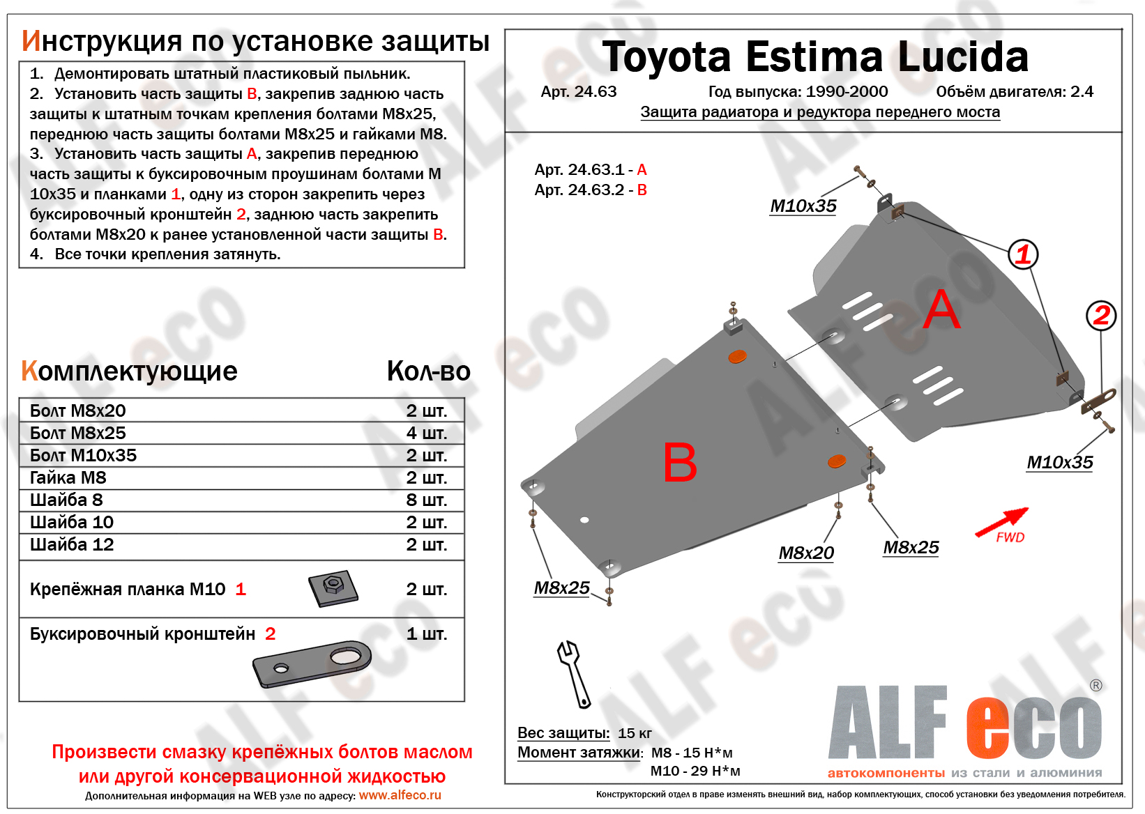 Защита алюминиевая Alfeco для радиатора и редуктора переднего моста Toyota Estima I Lucida 1990-2000. Артикул ALF.24.63al