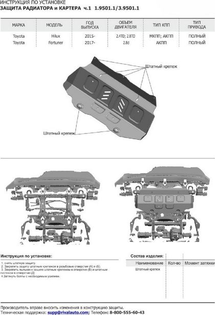 Защита Rival для радиатора, картера, КПП и РК Toyota Fortuner II 4WD 2017-2020 2020-2026. Артикул K111.5770.1