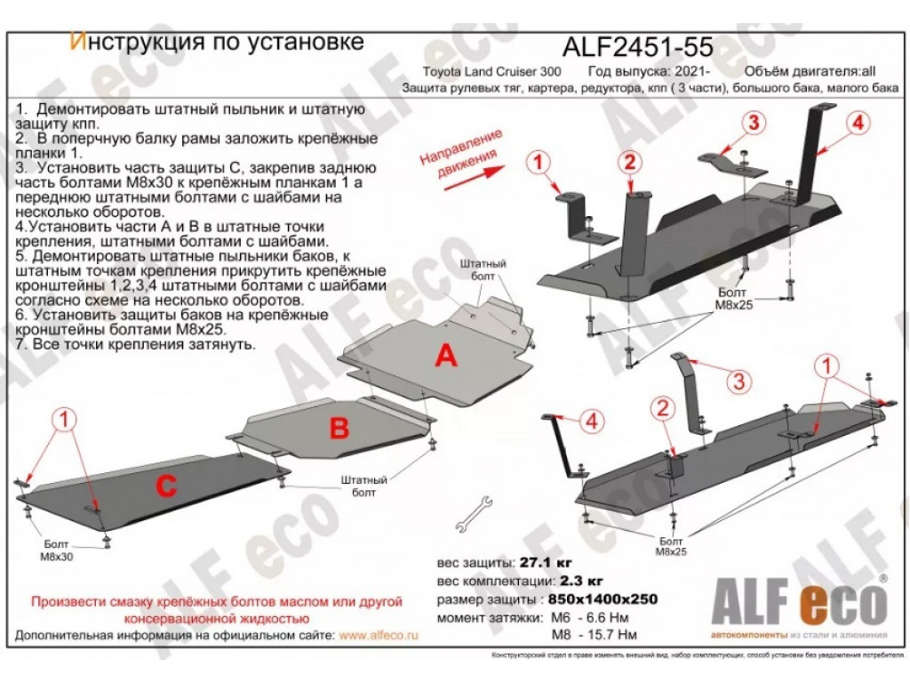 Защита Alfeco для рулевых тяг, картера, редуктора, кпп, бака (большой, малый) ( 5 частей) Toyota Land Cruiser 300 2021-2026. Артикул ALF.24.51-52-53-54-55