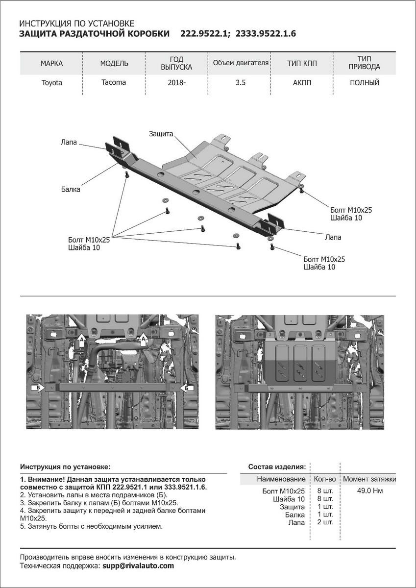 Защита алюминиевая Rival для КПП Toyota Tacoma III 4WD 2015-2019 2019-2026. Артикул 2333.9521.1.6