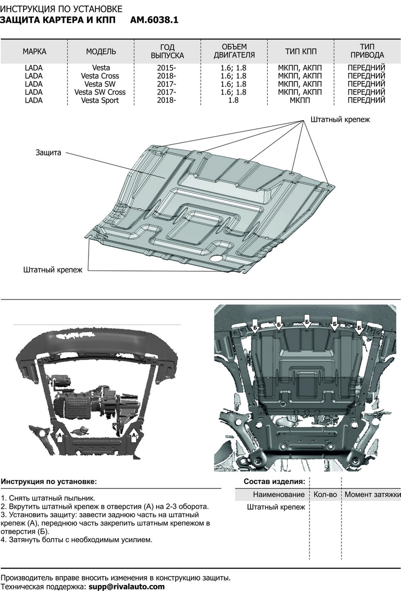 | Комплектация | защита - 1 шт., комплект крепежа, инструкция по установке, упаковка |