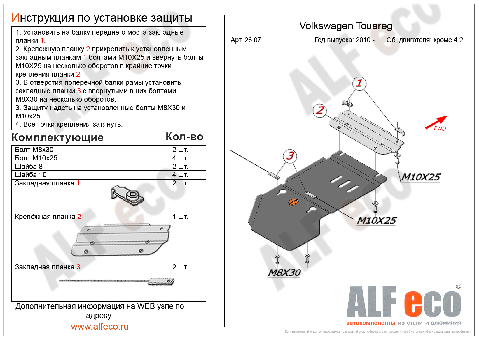 Защита Alfeco для АКПП и РК Volkswagen Touareg II 2010-2018. Артикул ALF.26.30