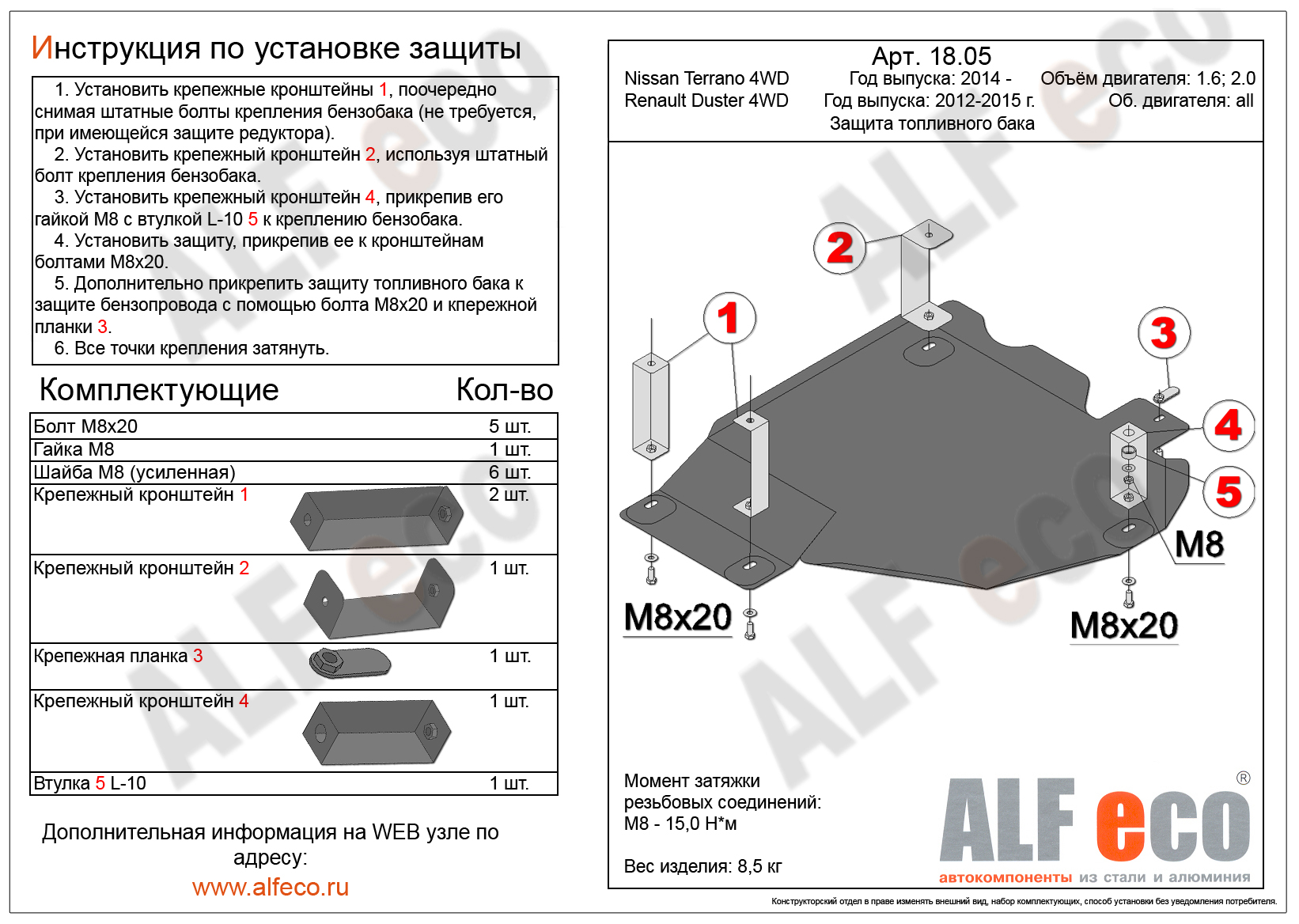 Защита алюминиевая Alfeco для топливного бака Nissan Terrano III 4WD 2014-2026. Артикул ALF.18.05al